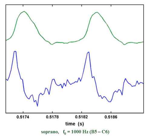 Meccanismo 3 (M3): è un meccanismo che consente di raggiungere frequenze anche molto elevate (1000-1400 Hz). Endoscopicamente le corde vocali sono estremamente tese e sottili. Spesso il contatto cordale manca e il suono viene emesso tramite un meccanismo “ad ancia”. Quando il contatto cordale – seppur minimo – è rilevabile, l’EGG mostra un segnale macroscopicamente molto simmetrico e di piccola ampiezza (analogo a quello dell’M2, vedi figura 10).