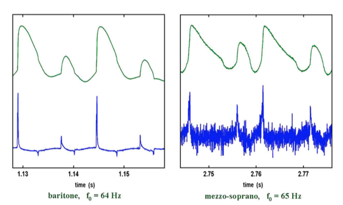 | Figura 7. Caratteristiche elettroglottografiche dell’M0 in un baritono e un mezzo soprano (da Roubeau et al.[xiv]) |