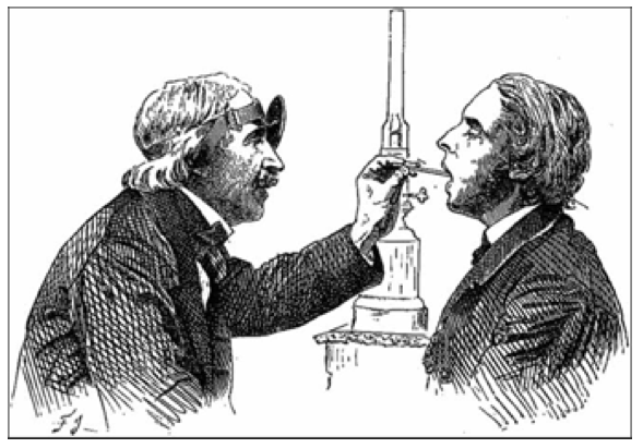 Il termine registro in riferimento alla voce è stato impiegato per la prima volta nel XIII secolo [i], adottato dalla terminologia relativa all’organistica [ii]. Fino al XIX secolo risultava assai difficile lo studio della fisiologia vocale, in quanto non esistevano molte delle tecnologie di cui disponiamo oggi. Essenzialmente le conoscenze di fisiologia fonatoria si basavano sullo studio della laringe tramite specchietti laringei (figura 1).