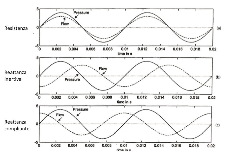 Il concetto di impedenza può essere applicato all’acustica vocale in termini di resistenza, inertanza e complianza acustica. L’impedenza acustica del vocal tract è una misura del rapporto tra la pressione e il flusso oscillanti all’ingresso del vocal tract (ovvero in prossimità della rima glottica). Se la sinusoide della pressione è in fase con la sinusoide di flusso si ha una condizione di impedenza resistiva, se la sinusoide di pressione è in anticipo rispetto alla sinusoide di flusso si verifica una condizione di reattanza inertiva, se la sinusoide di pressione è in ritardo rispetto a alla sinusoide di flusso si ha una condizione di reattanza compliante (fig. 2).