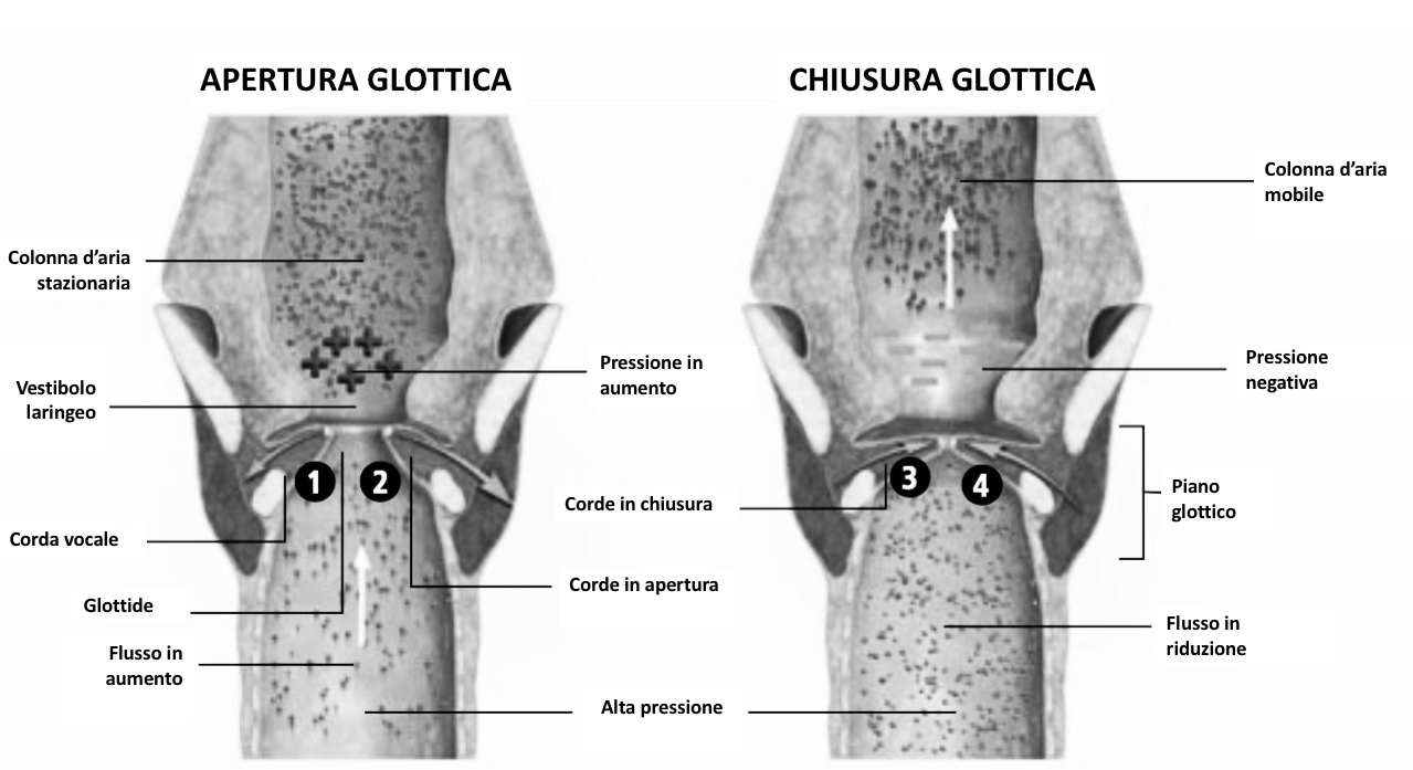 Questa spinta si verifica quando il movimento della colonna d’aria ha un preciso ritardo rispetto al movimento di apertura-chiusura delle corde vocali. Quando le corde vocali cominciano a separarsi all’inizio di un’oscillazione, la colonna d’aria tracheale viene spinta dalla risalita del diaframma nello spazio glottico e va a comprimere l’aria ferma a livello del vestibolo. L’inerzia della colonna d’aria nel vestibolo fa incrementare la pressione a livello della rima glottica, che viene ulteriormente spinta ad aprirsi. Quando il richiamo elastico spinge le corde ad addursi nella fase di chiusura glottica, il flusso d’aria attraverso la glottide si riduce. Per via dell’inerzia tuttavia, la colonna d’aria continua a muoversi verso l’alto, lasciando una condizione di vuoto a livello e sopra la glottide, che aiuta le corde ad unirsi con più efficacia e potenza (figura 3).