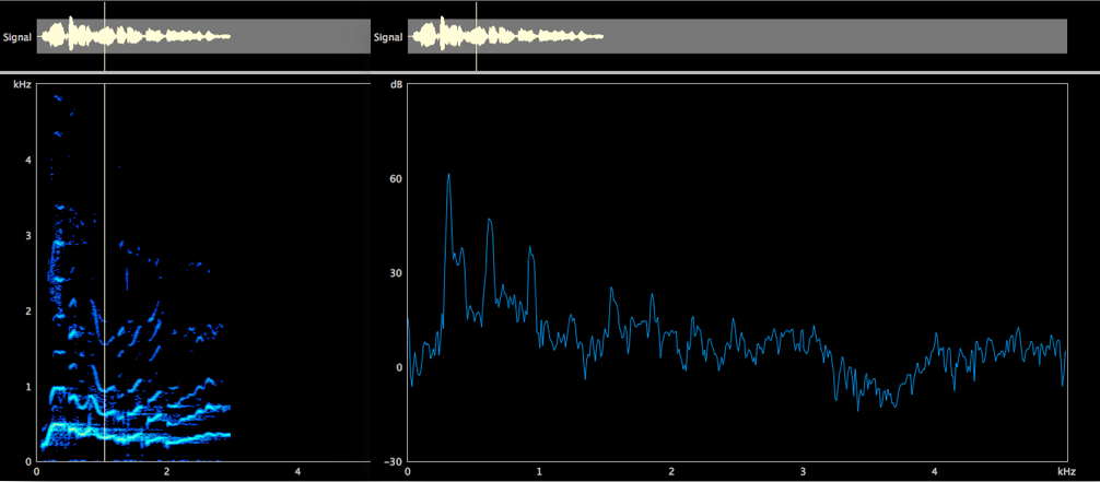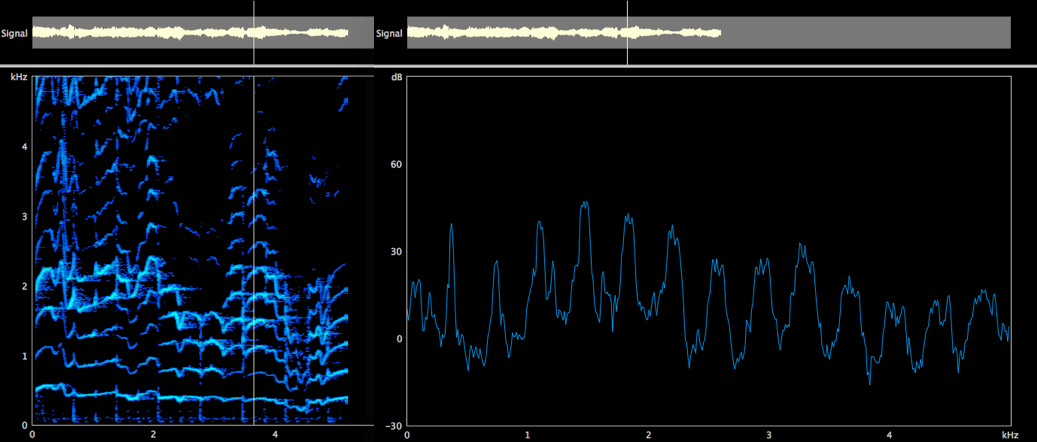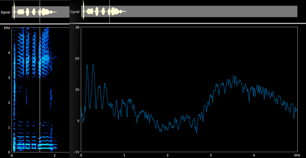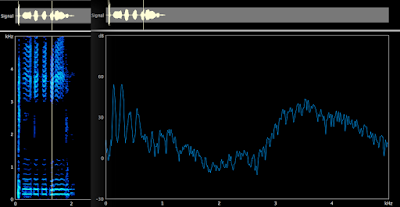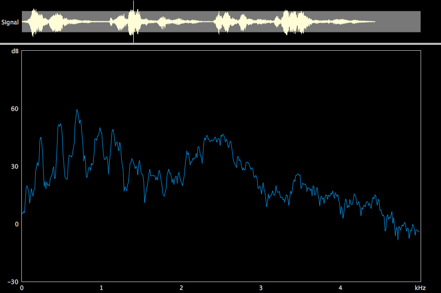 Una qualità con cui Bobby McFerrin si esprime spesso nel tema dei brani, nello scatting e nelle linee di basso, è quella dello speech. Questa modalità di emissione è essenzialmente neutra, si realizza nel meccanismo laringeo M1, senza grandi enfatizzazioni armoniche. Nell’analisi spettrografica e nel LTAS si osserva infatti uno spettro senza specifiche aree di rinforzo energetico, suggestivo di un’emissione senza atteggiamenti di particolare esaltazione frequenziale da parte del vocal tract (Fig. 1-3).